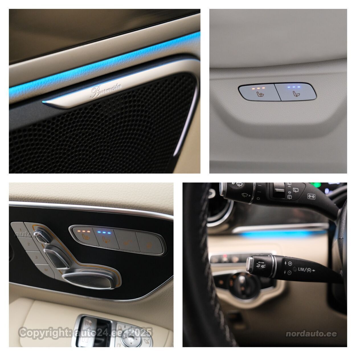 5 ustkliimaautomaatik, roolivõimendi (kiirustundlik), kesklukustus (puldiga), ABS pidurid, elektrooniline seisupidur, turvapadi, turvakardinad, immobilisaator, signalisatsioon, lisapidurituli, stabiilsuskontroll, kokkupõrget ennetav pidurisüsteem, pidurdusjõukontroll, sõiduraja hoidmise abisüsteem, pimenurga hoiatus, veojõukontroll, vihmasensor, ISOFIX lasteistme kinnitus (taga), kõrvalistuja turvapadja väljalülitamise võimalus, valgustuspakett, udutuled (tagumine), LED (päevatuled, tagatuled, lähituled, kaugtuled), päevasõidutulede automaatne lülitus, kaugtulede ümberlülitamise assistent, kurvituled, suverehvid, valuveljed (19", AMG), rehvirõhu kontrollsüsteem, reguleeritav roolisammas (kõrgus ja sügavus), multifunktsionaalne rool, nahkkattega rool, käiguvahetus roolilt, Burmester stereo (USB pesaga, originaal), helivõimendi, kõlarid, subwoofer, Apple CarPlay, Android Auto, ekraan (ees), navigatsiooniseade (kaardiga), autokompuuter, käed vabad süsteem, iluliistud salongis, jalamatid (kummist), topsihoidjad, tume laepolster, nahkpolster, 2x elektriliselt reguleeritavad istmed (2x mäludega), istmed reguleeritava kõrgusega (juhiiste, kõrvalistuja iste), reguleeritava kumerusega seljatugi, 4x istmesoojendused, ventileeritavad istmed (ees, taga), käetugi ees (laekaga), käetugi taga, tagaistme seljatugi allaklapitav, elektrilised välispeeglid (soojendusega, kokkuklapitavad), 2x elektrilised akende tõstukid, toonitud klaasid, katuseluuk (klaasist, elektriline), püsikiiruse hoidja (eessõitjaga distantsi hoidev), panoraamkatus (klaasist), 2x peeglid päikesesirmides (valgustusega), Webasto mootori eelsoojendus, eraldi kliimaseade tagaistmetele, automaatselt tumenevad peeglid (sees, väljas), uste sisevalgustus, kohtvalgustid, parkimisandurid (ees, taga), parkimiskaamera (360), Coming-/Leaving-Home funktsioon, start-stopp süsteem, 12v pistikupesad, õhkvedrustus, reguleeritav vedrustus (kõrgus), pakiruumi avamine elektriliselt, veokonks (teisaldatav), tagaklaasi soojendus, välistemperatuuri näidik, topeltklaasid, tagaklaasi puhasti